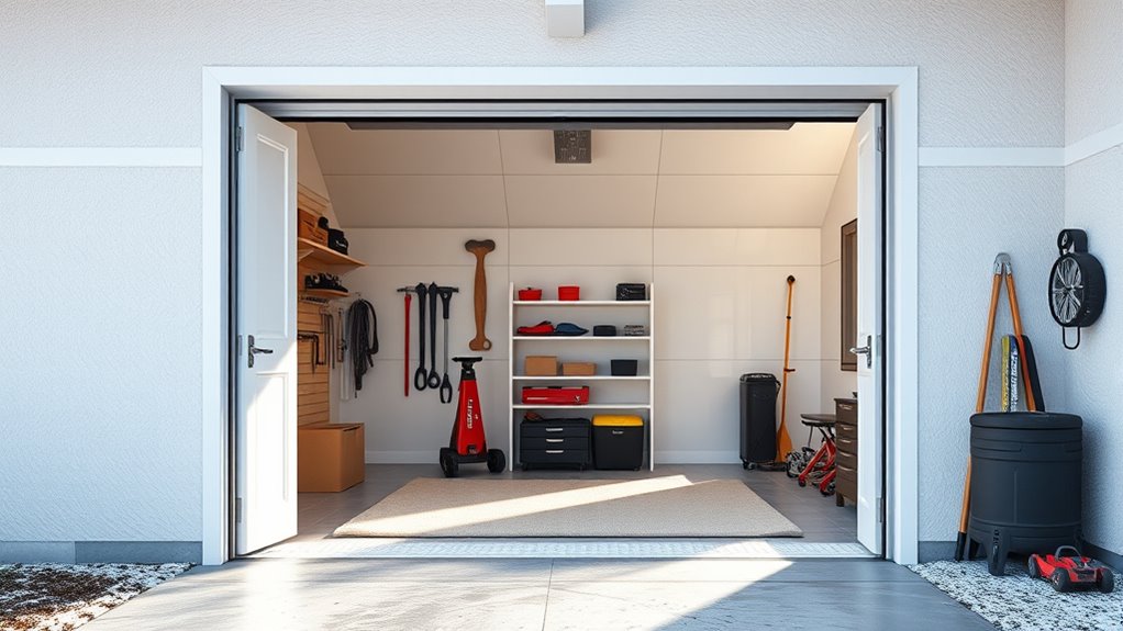 Understanding R-value effectiveness is vital because it directly impacts how well your garage stays warm during winter. The R-value measures how well insulation resists heat flow, with higher ratings offering better thermal protection. For winter, I recommend an R-value of 8 or higher to guarantee sufficient warmth and energy efficiency. Insulation with a low R-value might seem cost-effective initially but can lead to higher heating bills and less comfort indoors. When selecting a garage door insulation kit, I focus on the R-value to match my climate needs. A higher R-value provides more resistance to cold, helping me keep my garage warmer and reducing energy loss. Choosing the right R-value is essential for maintaining a cozy, energy-efficient space during those chilly months.