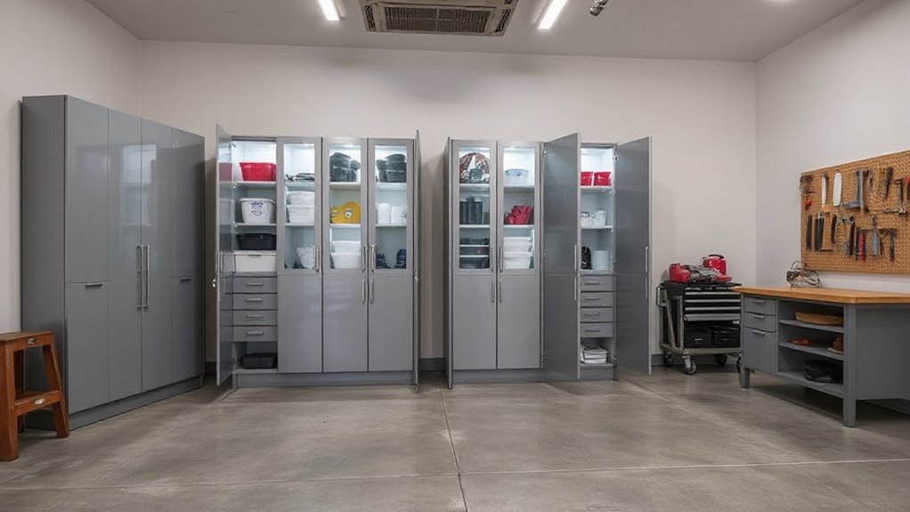 When choosing garage storage cabinets, flexibility is key to ensuring they meet your unique needs. Adjustable shelves let me customize space for items of different sizes and shapes, while modular designs allow me to reconfigure cabinets to fit my garage layout perfectly. Pre-drilled holes and mounting options give me the freedom to attach cabinets to walls or integrate them with other storage systems. Removable shelves and configurable compartments boost adaptability, making it easy to organize tools, supplies, or seasonal items. Additionally, lockable doors and customizable lock placements provide tailored security, so I can protect valuables or sensitive items. This level of customization helps me create a versatile, efficient storage system that evolves with my needs and keeps my garage neat and functional.