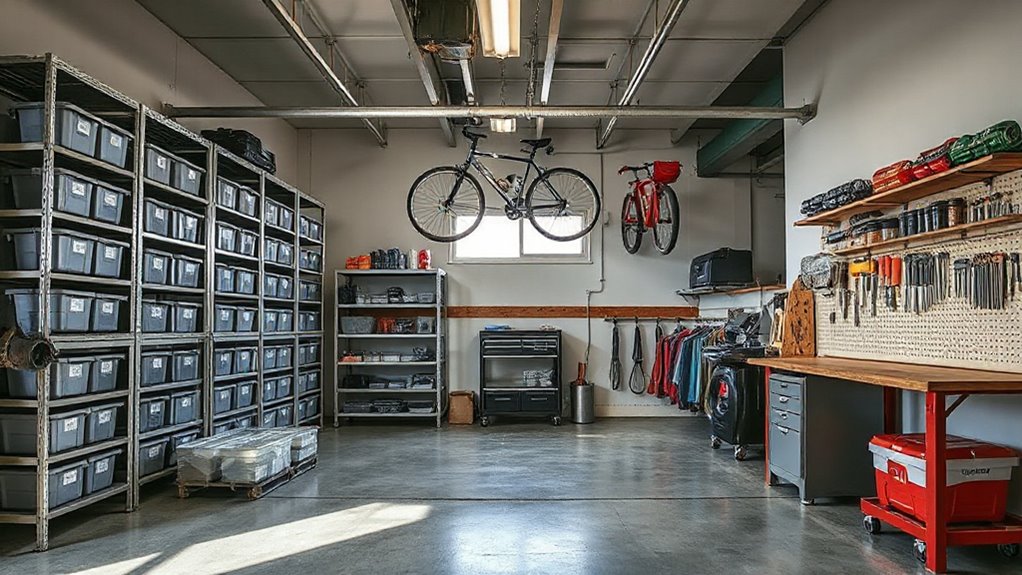 Imagine opening your garage door to a neat, organized space where every tool and box has its place—like a well-oiled machine. With the right storage system, you’ll transform chaos into clarity, making your garage feel more like a functional workshop than a cluttered storage room. It’s time to choose a system that fits your needs, so you can finally enjoy a clean, spacious garage where everything’s within reach, waiting to be used.
