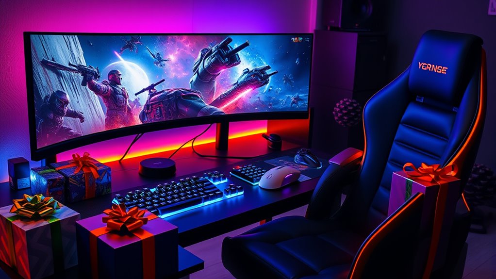 When selecting a gaming gift, it’s crucial to take into account the recipient’s gaming style to guarantee it truly enhances their experience. Think about whether they prefer console, PC, or mobile gaming, and choose items compatible with their platform. Consider their gaming approach—are they casual, competitive, or immersed in storytelling? This will help you pick accessories that boost their preferred style. Also, match the gift to their favorite genres, like FPS, RPG, or sports, for relevance and appreciation. Be mindful of their setup space and comfort needs to select ergonomic or space-saving gear. Finally, check their current gaming equipment to avoid duplicates and find complementary or upgrade options that truly elevate their play.