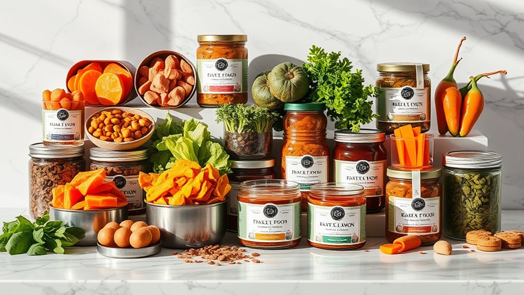 Imagine a bowl filled with vibrant, fresh ingredients—gourmet pet foods often pack higher-quality proteins and real fruits or veggies, making them more nutritious than regular brands. I’ve found they usually contain fewer fillers and artificial additives, offering better health benefits. While they might be pricier, I believe the enhanced ingredients mean my pet gets better nourishment, supporting their energy, coat, and overall wellness more effectively than standard options.