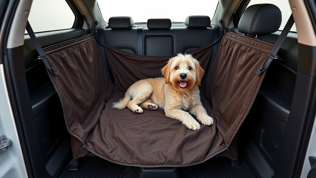 Since I like to keep essentials within easy reach during car trips, I pay close attention to the storage options on hammock-style pet car seat covers. Many of these covers have built-in pockets for treats, toys, leashes, and other necessities, helping me stay organized. The pockets come in various sizes, so I can find quick access to what I need without digging through clutter. Some models even include dedicated spaces for water bottles, bowls, or grooming tools, which adds convenience on longer trips. The placement and size of these pockets are carefully designed to avoid interfering with my pet’s comfort or safety. Extra storage options allow me to carry everything I need seamlessly, keeping my vehicle tidy and ensuring a stress-free journey.