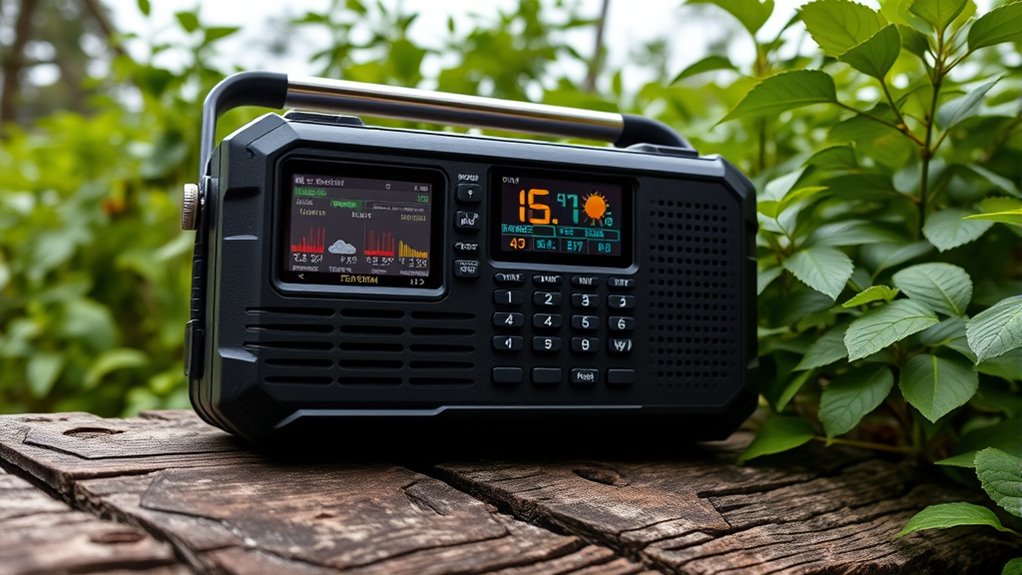 Choosing the right power sources for a hand crank radio with weather alerts is essential for staying connected during emergencies. I look for radios with multiple options like hand crank, solar, USB, and batteries to guarantee continuous operation. Checking battery capacity is important; I prefer models with at least 5000mAh to assure longer usage and reliable backup power. The hand crank mechanism should be durable and easy to operate, providing enough energy without causing fatigue. Solar panels are a great addition—larger panels over 8500mm² charge faster and perform better in low-light conditions. Additionally, having extra charging options like AC adapters and USB ports adds versatility, making sure I can recharge the device in various emergency scenarios. This blend of power sources keeps me prepared and connected when it matters most.