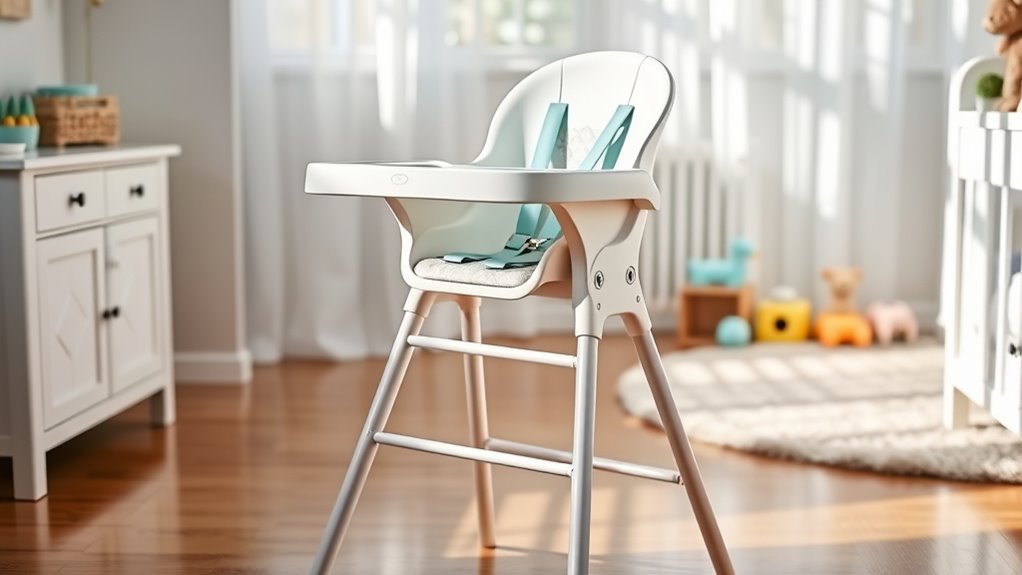 Choosing a high chair with the right safety features is essential to keep your baby secure during mealtimes. I always look for models with a secure harness system, like a 3-point or 5-point harness, to ensure my little one stays safely restrained. It’s also important to pick a chair with a sturdy, non-slip base or feet to prevent tipping or sliding on smooth surfaces. I verify that the materials are durable and free from harmful chemicals such as lead, phthalates, and BPA—safety first! I also check for safety certifications like ASTM or CPSC approval, which show the chair has been tested thoroughly. Ultimately, adjustable safety features like removable trays and adaptable harnesses give me peace of mind as my baby grows, ensuring a snug, secure fit at every stage.