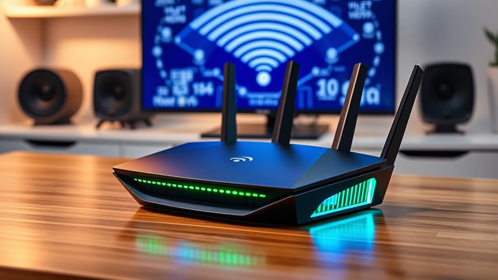 If you’re searching for the best high-end routers that deliver lightning-fast, reliable Wi-Fi in 2026, I’d suggest looking into options like Wi-Fi 7 and Wi-Fi 6E models from top brands such as NETGEAR, TP-Link, and Gryphon. These routers offer speeds up to 17 Gbps, extensive coverage for large homes, and advanced security features. They’re also future-proof with multi-gig ports and mesh capabilities. Stick around to discover how each of these models can elevate your internet experience.