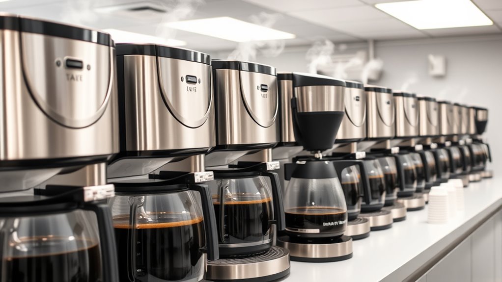 Brewing speed and efficiency play a significant role in selecting the right high-capacity drip coffee maker for busy office environments. I look for models that can brew a full 12-cup pot in under 10 minutes, ensuring quick service during peak hours. Efficient machines often feature multi-stream shower heads that evenly saturate coffee grounds, which speeds up extraction and reduces overall brewing time. Features like programmable delay brew let me set a schedule so fresh coffee is ready when I arrive, saving valuable time. Brew pause functions are also handy—they let me pour a cup mid-brew without stopping the process. Additionally, automatic shutoff and warming plates help maintain temperature and freshness, minimizing the need for repeated brews and maximizing efficiency throughout the day.