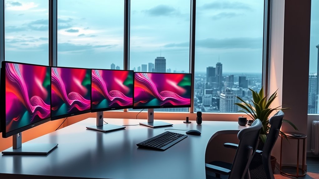 Having explored ergonomic design features, it’s time to contemplate the different panel technologies that can substantially affect your productivity. I prefer IPS panels for their wide viewing angles and accurate color reproduction, which are essential for detailed work. If you’re into media consumption or design, VA panels might catch your attention with their impressive contrast ratios, providing deep blacks. While TN panels offer quicker response times, their narrow viewing angles and poorer color accuracy make them less suitable for professional tasks. Finally, OLED panels deliver breathtaking contrast and vibrant colors, but their higher cost and potential burn-in issues are worth considering. Ultimately, the right panel technology plays a vital role in optimizing your work experience.