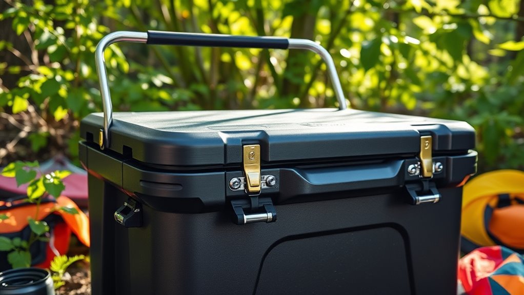 Choosing a high-end camping cooler requires more than just excellent insulation; weather resistance and sealing are essential factors that can make or break your outdoor experience. Effective weather resistance depends on features like UV inhibitors, impact-resistant shells, and corrosion-proof latches, which protect against sun damage, impacts, and rust. Superior sealing comes from thick gasketed lids, threaded drain plugs, and double-locking mechanisms that prevent air and water leaks, keeping your food and drinks cold longer. High-quality coolers often incorporate Cool Riser Technology or foam insulation barriers that elevate the cooler from hot surfaces, reducing heat transfer. Proper sealing and weatherproofing minimize melting caused by external heat, humidity, and sunlight, extending the internal cold lifespan. Ensuring a tight lid closure with secure latches is essential during outdoor adventures.