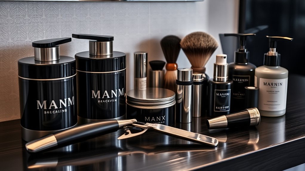 When evaluating high-end men’s grooming kits, the design and aesthetics play a pivotal role in enhancing both functionality and visual appeal. I look for sleek, modern designs crafted from premium materials like stainless steel, leather, or high-grade plastic, which instantly elevate the kit’s look. Attention to detail matters—polished finishes, minimalist layouts, and sophisticated color schemes such as matte black, chrome, or leather accents create a refined appearance. Ergonomic instrument shapes not only look stylish but also guarantee comfortable handling. The visual presentation, including premium cases and organized tool layouts, substantially boosts the kit’s luxury feel. A well-designed grooming set reflects quality, complements personal style, and transforms the grooming routine into a visually pleasing experience.