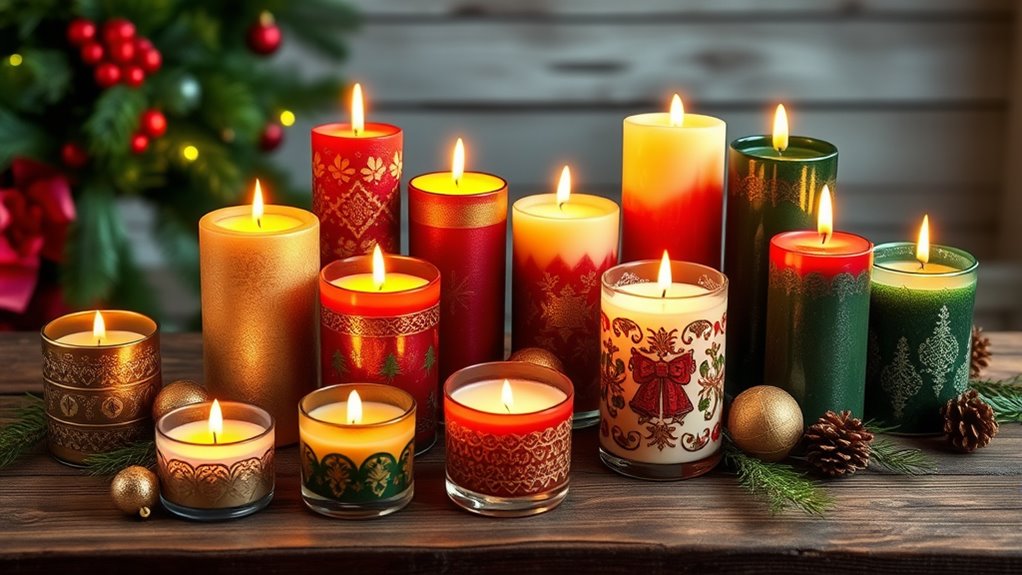 Think of choosing the perfect holiday candle set as tending a cozy garden. Each candle is a blooming flower, adding warmth and color to your festive space. When you pick the right scents and styles, you create a lush sanctuary that welcomes love and cheer. So, let your selection be the gardener’s touch—nurturing comfort, joy, and the glow of the season into your home with every flicker.
