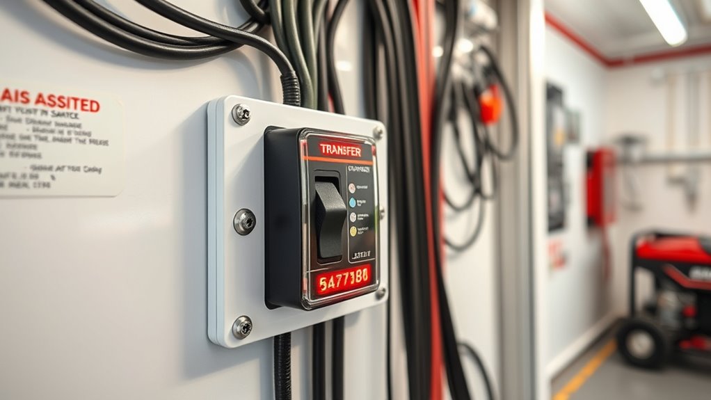 Think of your transfer switch as the heart of your backup system, needing regular check-ups to keep it healthy. I recommend inspecting it annually for signs of wear, corrosion, or loose connections. Keep it clean and make certain the wiring is tight. Test it periodically by simulating a power outage, so you’re confident it’ll work when needed. Proper maintenance guarantees your switch stays reliable and safe year after year.
