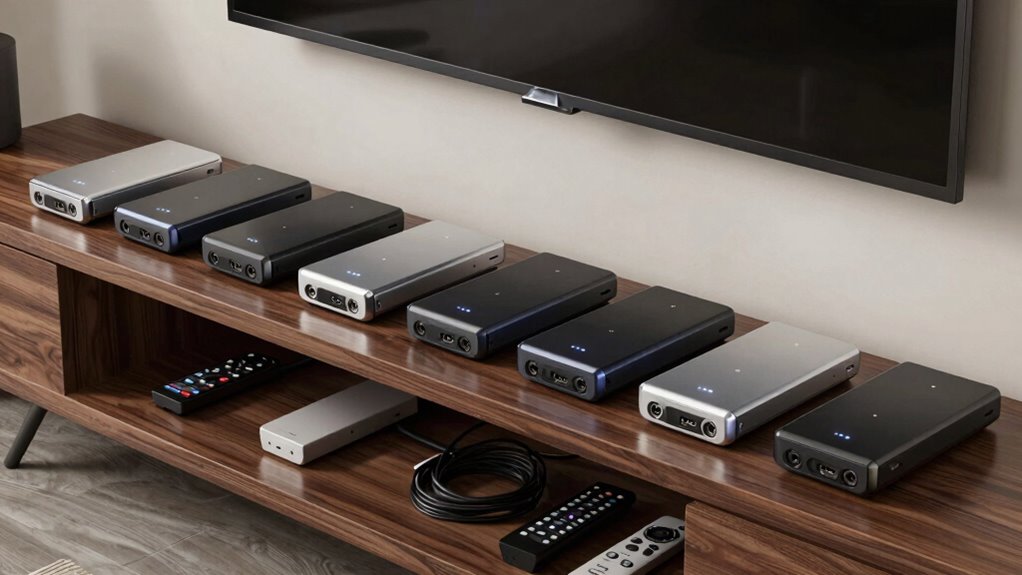If you’re looking to simplify your home entertainment setup, I’ve found that the top IR blaster hubs make controlling multiple devices effortless. From WiFi and Zigbee controllers to universal remotes, these hubs offer compatibility with countless brands and features like voice control and scene automation. They can extend IR signals beyond line-of-sight and replace multiple remotes. If you want an easy way to streamline your system, I’ll share more about the best options and how to choose them.
