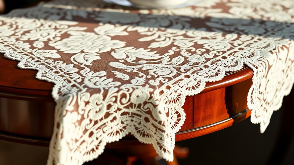 Durability in lace fabrics is like finding a sturdy thread woven into delicate art. For everyday dining, I recommend polyester lace or blended fabrics—they’re resilient, stain-resistant, and hold up well over time. These materials let you enjoy the elegance of lace without the constant worry of wear and tear, making them perfect for regular use. Trust me, they’re the practical yet beautiful choice for your dining table.