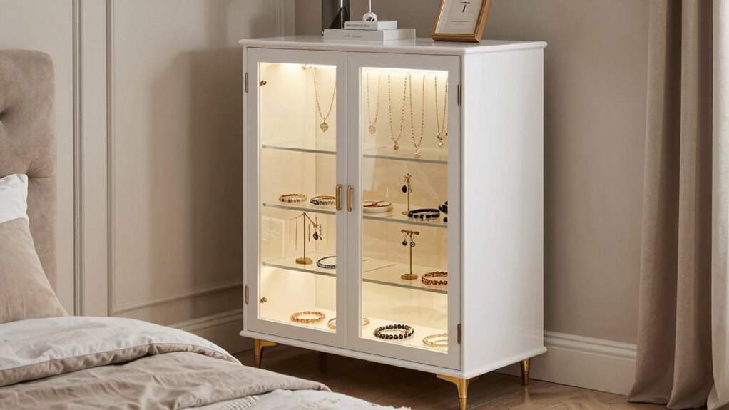 I recommend placing your jewelry armoire in a spot that’s both accessible and protected. Near your dresser or vanity works well, so you can easily grab your jewelry while getting ready. Keep it away from direct sunlight and humid areas to prevent damage. A corner or wall space with good lighting is ideal, making it simple to see your collection and keep everything organized without cluttering your room.