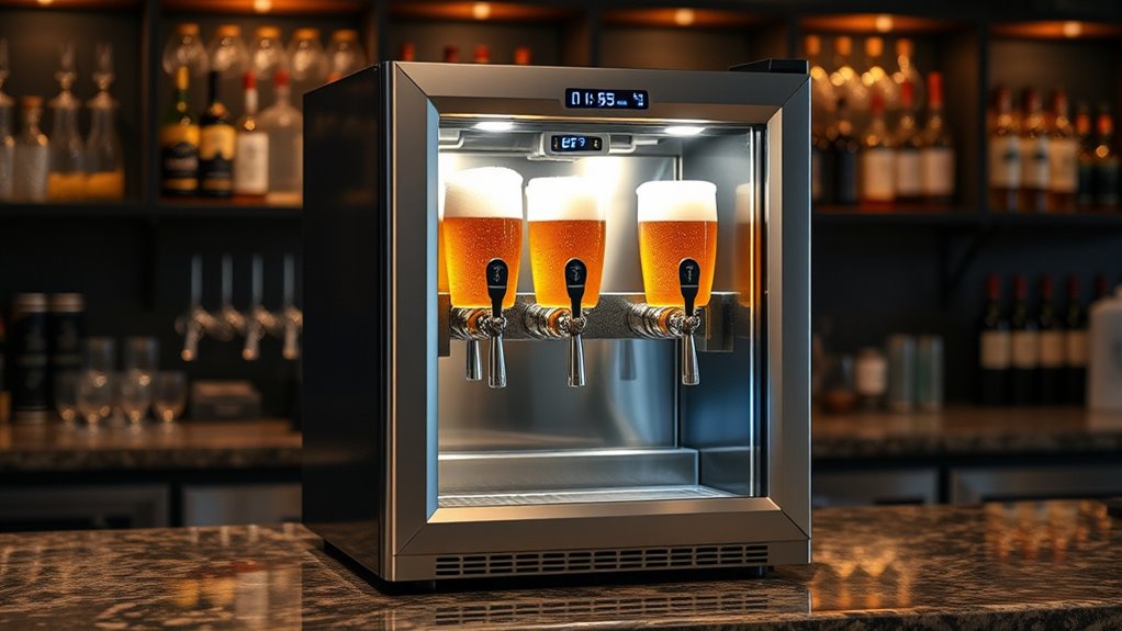 Achieving the perfect beer temperature depends heavily on a kegerator’s ability to maintain precise temperature control. Digital temperature displays make monitoring and adjustments straightforward, offering better accuracy than analog thermostats. Being able to set temperatures as low as 32°F ensures your beer stays ice-cold, while ranges up to 50°F accommodate other beverages. Fan-forced cooling systems distribute temperature evenly, preventing hot spots and ensuring consistency from top to bottom. Many models feature rapid cooling or Deep Chill functions, allowing quick adjustments for freshly delivered kegs. This precision helps preserve beer flavor and freshness, making every pour perfect. When choosing a kegerator, look for features that promise accurate, reliable temperature control to ensure your beer stays just right every time.