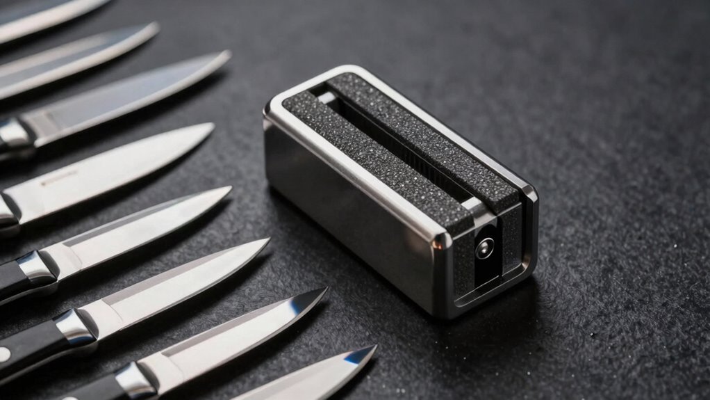 Choosing the right knife sharpener depends on understanding the different sharpening types available, each suited for specific needs. Manual sharpeners use abrasive rods or stones to physically grind and restore dull blades, offering control and precision. Electric sharpeners automate this process with motor-driven abrasive wheels, making quick work of dull knives. There are also various techniques like honing, which realigns the edge without removing metal, sharpening for reconditioning very dull blades, and polishing to refine the edge for smoother cuts. Some sharpeners come with adjustable angles or multiple stages to suit different knife styles and preferences. Your choice depends on the knife’s condition, blade material, and how sharp you want it. Different techniques can also produce varying edge angles, influencing cutting performance and durability.