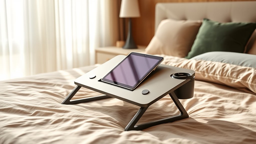 Are built-in comfort features really essential when choosing a lapstand for bed? Absolutely. Features like soft wrist rests and cushioned pads help reduce strain during long use, making your experience more comfortable. Adjustable height and angle settings allow you to customize the stand for ergonomic support, promoting better posture. Anti-slip blockers and secure device clips prevent slipping or falling, enhancing safety and confidence while working or browsing. Contoured or padded surfaces conform to your lap, evenly distributing weight for prolonged comfort. Plus, heat shields and ventilation slots help prevent overheating, ensuring the lapstand stays cool and usable over extended periods. These features may seem minor, but they markedly improve usability, making your time in bed more comfortable, safe, and enjoyable.