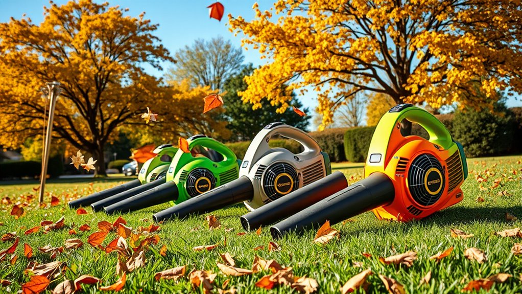If you’re searching for the 15 best leaf blowers for 2025, I’ve looked into powerful, quiet, and easy-to-use options. From cordless models with up to 765 CFM and 280 MPH wind speed to lightweight designs weighing just over 1 pound, there’s something for everyone. Many offer adjustable airflow, quick battery life, and low noise. Keep exploring, and you’ll discover which blower suits your yard cleaning needs perfectly.