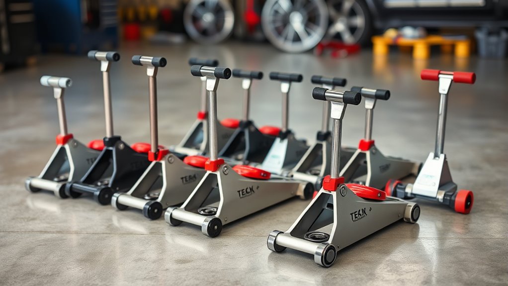 Choosing a low-profile aluminum floor jack often comes down to weight and portability. Lighter jacks, typically between 30 to 60 pounds, are much easier to carry and maneuver, especially in tight spaces. Features like detachable handles and foldable components make storage more compact, enhancing portability. While steel jacks tend to be sturdier, they can weigh over 70 pounds, making them harder to move around. Wheels and side handles are valuable additions that improve mobility, particularly when positioning the jack under a vehicle. A lightweight design not only simplifies transportation but also reduces user fatigue during frequent use. If you’re working solo or in confined areas, prioritizing a jack with a manageable weight and convenient features guarantees safer, easier lifting with less strain.