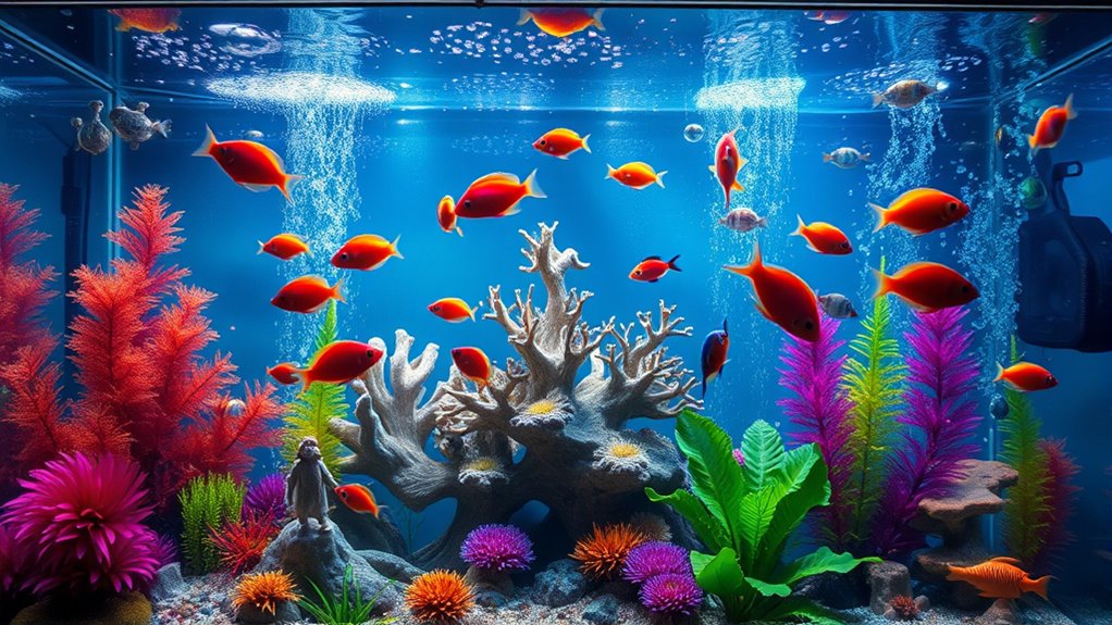 Luxury aquarium accessories can positively impact fish health and behavior by creating a more natural and stimulating environment. I’ve noticed that high-quality ornaments, advanced filtration, and proper lighting reduce stress and encourage natural activities like hiding and exploring. They also promote better water quality and habitat stability, which keeps my fish healthier. When I invest in these accessories, I see happier, more active fish that thrive in their enriched, luxurious home.