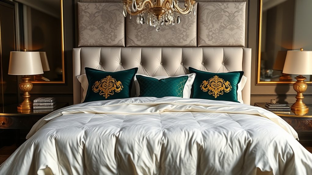 Choosing luxury bedding sets starts with understanding the quality of their materials, as this directly impacts comfort and durability. Premium fabrics like Egyptian cotton, silk, and bamboo offer superior softness and resilience, making your sleep feel indulgent. The thread count, often between 600 and over 1200, influences how smooth and strong the fabric feels; higher counts usually mean a more luxurious touch. The weave type matters too—sateen feels silky and lustrous, while percale delivers a crisp, matte finish. Naturally breathable fibers like Egyptian cotton and bamboo help regulate temperature and wick moisture, boosting sleep comfort. Additionally, eco-friendly certifications like OEKO-TEX guarantee the materials are free from harmful chemicals, giving you peace of mind along with luxury.
