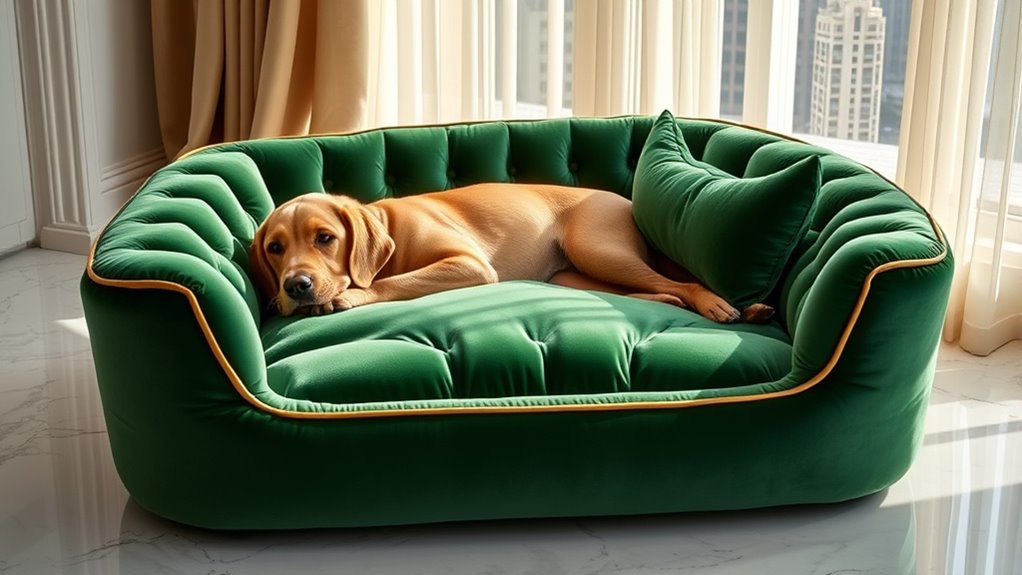 Adding memory foam provides ultimate comfort, while sleek, modern designs elevate style. I love beds with washable covers for practicality and ease. Plush bolsters offer cozy support, and stylish accents like metallic legs or tufted fabrics make the bed a statement piece. Combining these features creates a perfect blend of luxury and functionality, making your dog’s space both comfortable and chic. It’s all about balancing aesthetics with everyday convenience.