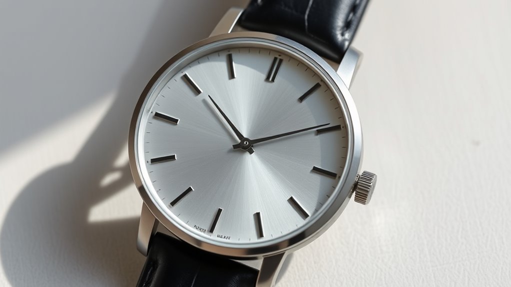 Since simplicity lies at the core of minimalist watch design, it’s essential to focus on clean, uncluttered dials with subtle hour markers and minimal complications. A true minimalist watch features a slim profile, usually under 8mm thick, which adds to its understated elegance. Monochromatic color schemes like black, white, or metallic tones help create a sleek, versatile look that works with any outfit. Material choices, such as leather straps or mesh bands, enhance the watch’s refined appearance without overwhelming the design. When selecting a minimalist watch, pay attention to balance and proportion; the design should feel harmonious and unobtrusive. Ultimately, the goal is to find a piece that offers understated style, effortless versatility, and a refined sense of simplicity.