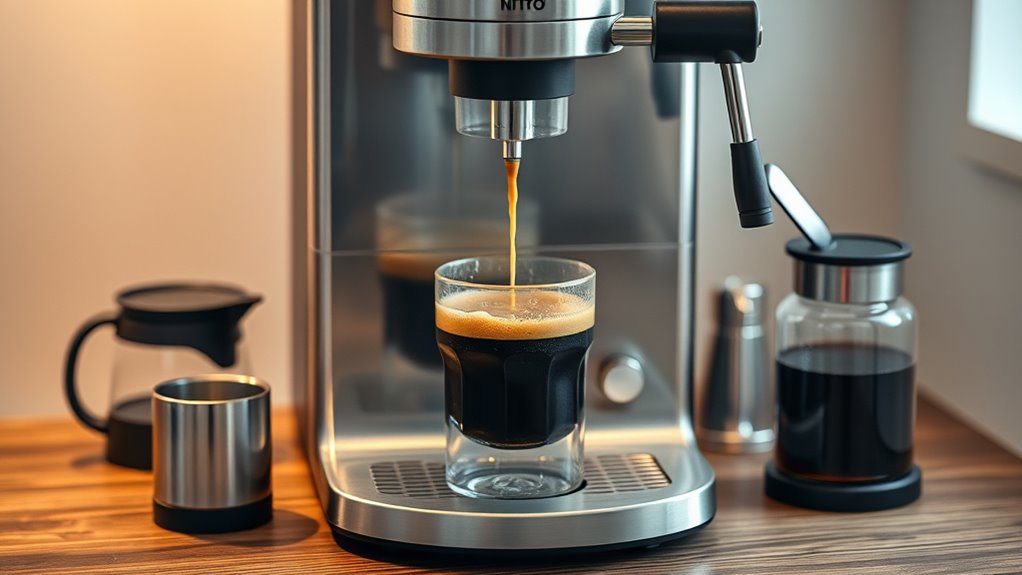 When choosing a nitro cold brew system for your home, it’s important to contemplate how its design and aesthetics will fit with your existing coffee setup. You want a system that complements your style, whether modern, rustic, or minimalist. Look for models with sleek, durable exteriors made from stainless steel or high-quality materials that resist corrosion and scratches. An attractive dispensing tap or faucet can elevate the visual appeal and mimic professional draft systems, adding to your home bar decor. Compact, space-efficient designs are ideal for easy storage in standard refrigerators or mini-kegerators, preventing clutter. Features like integrated carry handles, streamlined layouts, and visual indicators for pressure or gas levels not only enhance functionality but also contribute to a polished, cohesive look.