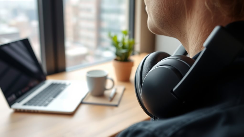 When selecting noise-canceling headphones for remote work, it’s crucial to guarantee they are compatible with your devices and software. I recommend checking if the headphones support the connectivity options you need, like Bluetooth versions (such as 5.2 or 5.3) or wired options like USB or a 3.5mm jack. Make sure they work seamlessly with your operating system—Windows, macOS, iOS, or Android—and essential conferencing apps like Zoom, Teams, or Skype. If you switch between devices, dual-device support can be a game-changer, ensuring smooth transitions. Also, verify the Bluetooth range and connection stability to avoid audio dropouts. Ultimately, confirm that the microphone and noise cancellation features are optimized for your communication platforms, so your calls sound clear and professional.
