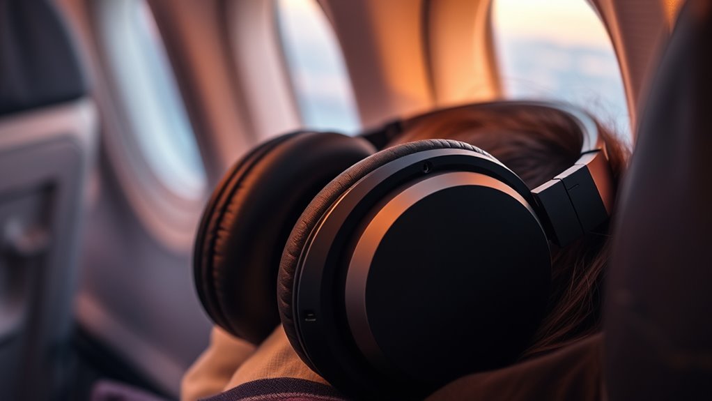 Choosing noise-canceling headphones for travel means paying close attention to their ability to block out ambient sounds effectively. High-quality models can reduce noise levels by at least 90%, creating a more immersive experience. Hybrid active noise cancellation uses internal and external microphones to detect and neutralize a broad range of sounds, including engine hum and cabin rumbles, often by over 95%. This technology is particularly useful on planes, where low-frequency noises are prevalent. Keep in mind, noise cancellation effectiveness can vary depending on the mode selected, such as transparency or standard ANC, which adjust how much external sound is permitted. Reliable headphones maintain consistent performance across different environments, ensuring you enjoy peace and quiet whether on a plane, train, or busy street.