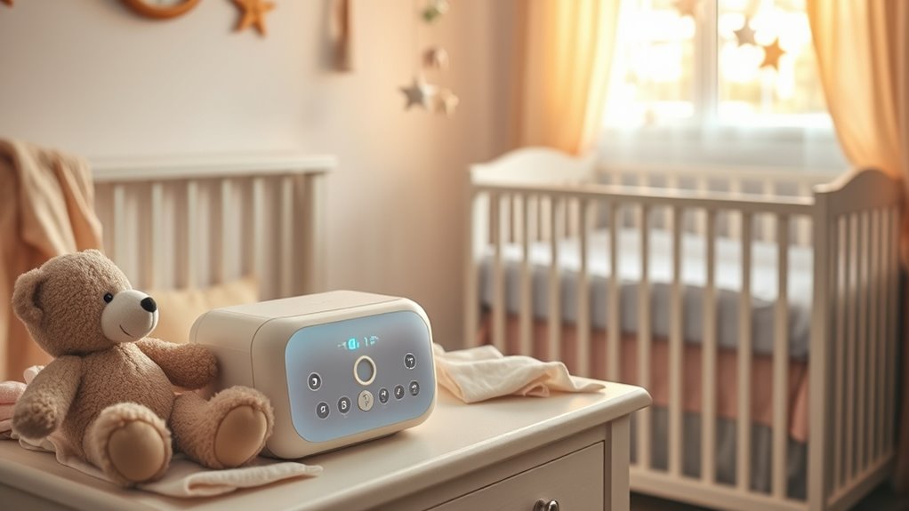 Light customization features play a essential role in shaping a nursery environment that promotes relaxation and comfort. Adjustable brightness levels and color options let me create a calming atmosphere tailored to my baby’s needs. I appreciate the ability to toggle night lights on or off and choose from multiple colors, which helps set the right mood during bedtime routines. Dimming capabilities and preset lighting modes reduce overstimulation, making it easier for my little one to unwind and fall asleep. Some devices even have memory functions that save preferred settings, ensuring consistency night after night. Adjustable night lights are also handy for activities like diaper changes or feeding, providing enough illumination without disturbing sleep. Overall, flexible light features add convenience and help foster a soothing environment.