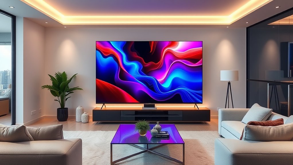 Choosing the right OLED TV involves considering your viewing environment to guarantee ideal picture quality and comfort. If you watch in a bright room, look for models with UL verification for Discomfort Glare Free (UGR <22), which helps reduce reflections and glare. Brightness booster technology enhances luminance at the pixel level, making the picture vivid even in well-lit spaces. High contrast ratios and luminous details are essential for clear images without washout in variable lighting conditions. Glarе-free certification indicates the TV’s ability to minimize eye strain in bright settings. Additionally, adjustable picture modes and anti-reflective coatings can optimize your viewing experience across different lighting environments, ensuring comfort and clarity whether you’re watching during the day or night.