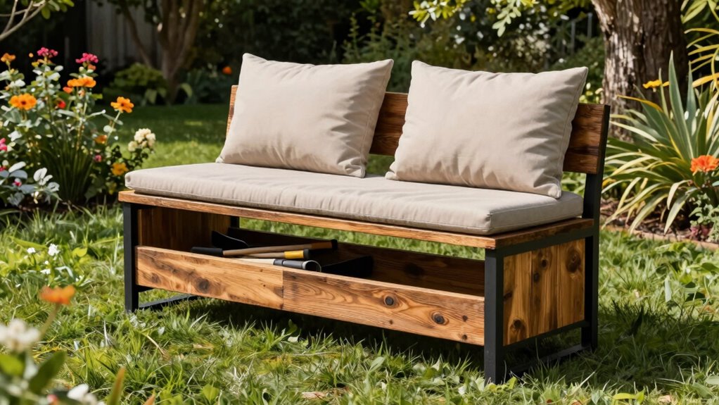 Think of outdoor storage benches as a garden’s faithful guardian—they need some care to stay strong. I find that regular maintenance, like cleaning and inspecting for damage, keeps them looking great. Sealing isn’t always necessary, but if you notice weathering, a fresh coat of sealant can be like armor against the elements. With a little upkeep, your bench will be a lasting, dependable part of your outdoor space.