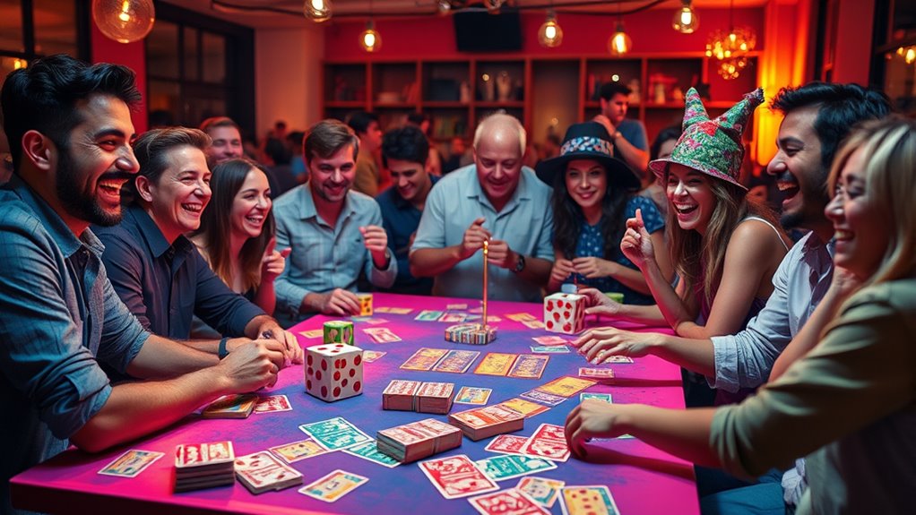 The level of social interaction in party games can substantially impact how engaged and comfortable everyone feels. Some games are more passive, involving observation, while others demand active participation through talking, movement, or teamwork. Highly interactive games foster stronger bonds by encouraging verbal communication and physical activity, making everyone feel involved. Games that prompt players to share personal stories or opinions can deepen connections and create a sense of camaraderie. However, the complexity of social cues—like reading body language or tone—also matters, as it affects how well players can engage. Choosing a game with the right interaction level guarantees that all participants feel comfortable, stay engaged, and enjoy the experience without feeling overwhelmed or disconnected.