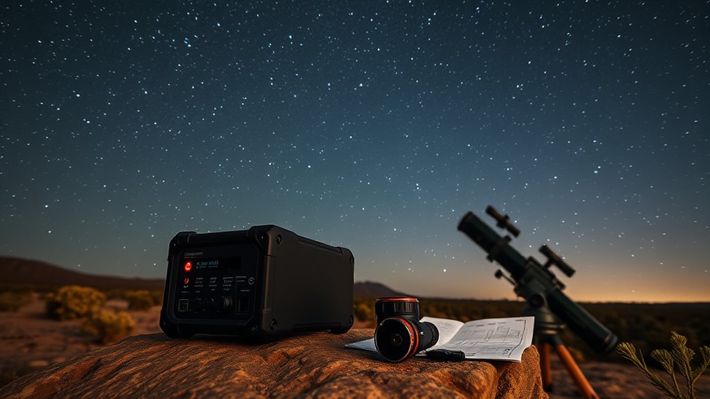 Battery longevity and cycle life play a significant role in choosing a portable power station for astronomy. The number of charge cycles a battery can withstand directly influences its overall lifespan and long-term value. Lithium iron phosphate (LiFePO4) batteries, for example, typically endure over 3,000 to 3,500 cycles before capacity drops below 80%, making them ideal for frequent use. As the cycle count reaches its limit, the battery’s capacity gradually declines, reducing runtime and requiring maintenance or replacement. Proper charging habits—avoiding overcharging and deep discharges—can extend the battery’s effective cycle life. Ultimately, understanding a power station’s cycle longevity helps you estimate its durability and suitability for prolonged outdoor adventures or emergency situations, ensuring your stargazing sessions remain uninterrupted.