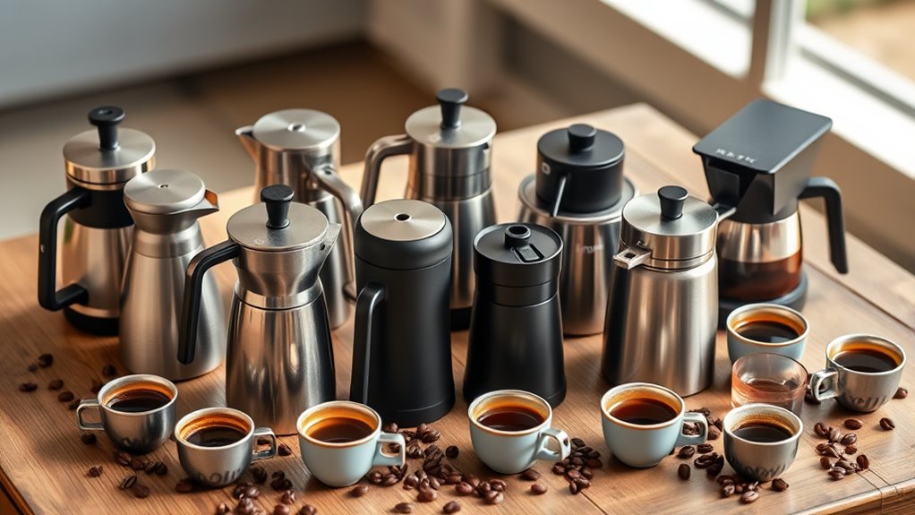 I’ve tested and used many portable espresso makers suitable for travel, camping, and outdoor adventures. These compact devices support ground coffee, capsules, and powders, deliver up to 20 bars of pressure, and heat water quickly, often in just a few minutes. They’re lightweight and durable, making them perfect for on-the-go coffee whenever you need a rich espresso. Stick around to uncover the top options and key features for your ideal portable coffee setup.