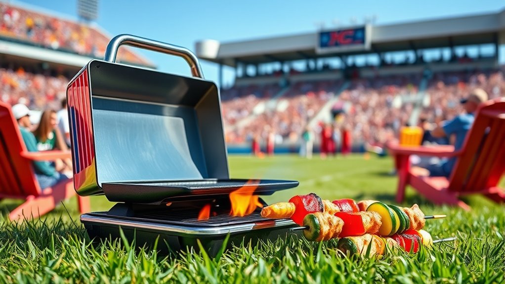Selecting a portable grill that matches your preferred fuel source is essential for convenient and hassle-free tailgating. Whether you prefer propane, charcoal, or gas, choosing a compatible grill guarantees smoother setup and operation. Check the fuel capacity and consumption rate to gauge how long you can cook without refueling, especially during extended events. Some grills support multiple fuel types or have adapters, offering added versatility if you switch fuels or want options. Portability features like compact fuel canisters and easy storage also matter, making transport and fueling straightforward. Finally, consider safety standards and regulations related to your chosen fuel to ensure safe outdoor use, avoiding hazards and ensuring a worry-free tailgate experience.