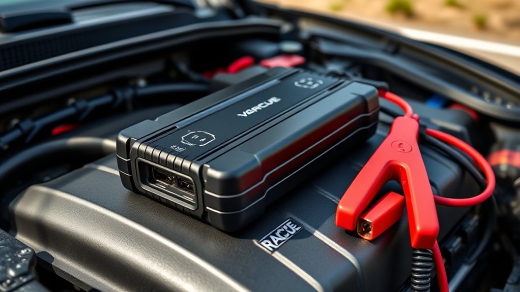To guarantee your portable jump starter works reliably, it’s essential to verify that it’s compatible with your vehicle’s specifications. First, check that it supports your engine size—most are suitable for engines up to 6.0L gas or 3.0L diesel. Make sure the device matches your vehicle’s voltage system, typically 12V for passenger cars. Confirm it includes clamps and cables rated for your battery type and size to prevent damage or inefficiency. The jump starter’s peak current output should be sufficient for your vehicle; for most cars, 1000A or higher is ideal. Finally, verify support for your fuel type and engine configuration, especially if you drive a diesel or specialized vehicle, to guarantee safe, reliable operation during emergencies.