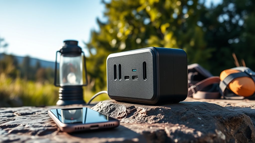 Selecting the right portable power station involves more than just capacity; it also requires careful consideration of the available ports. I look for models with a variety of output options like AC outlets, USB, USB-C, and DC ports to guarantee compatibility with all my devices. Multiple ports allow me to charge smartphones, laptops, cameras, and small appliances at the same time, which is essential during outdoor trips or emergencies. I also check the power ratings and surge capacities of each port to match my devices’ needs and prevent overloads. Versatile port configurations, such as fast-charging USB-C and multiple AC outlets, provide extra flexibility. Finally, I verify that the port interfaces are compatible with my existing cables and connectors for seamless device connectivity.