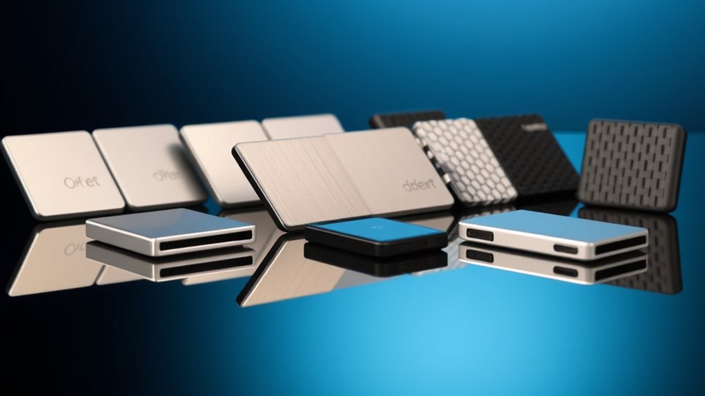 To guarantee peak performance, it’s essential to take into account thermal management capabilities in portable SSD drives. Effective thermal management prevents overheating, ensuring consistent performance during those long data transfers. I’ve noticed that many high-performance drives use heat sinks, aluminum enclosures, or thermal pads to dissipate heat, which keeps their operating temperatures ideal. Elevated temperatures can cause thermal throttling, slowing down transfer speeds to protect internal components—definitely something you want to avoid. Drives with solid thermal designs often have temperature sensors that monitor heat levels and adjust performance as needed. Plus, proper thermal management extends the lifespan of SSD components by reducing thermal stress and preventing heat-related damage, so it’s a key factor in your selection process.