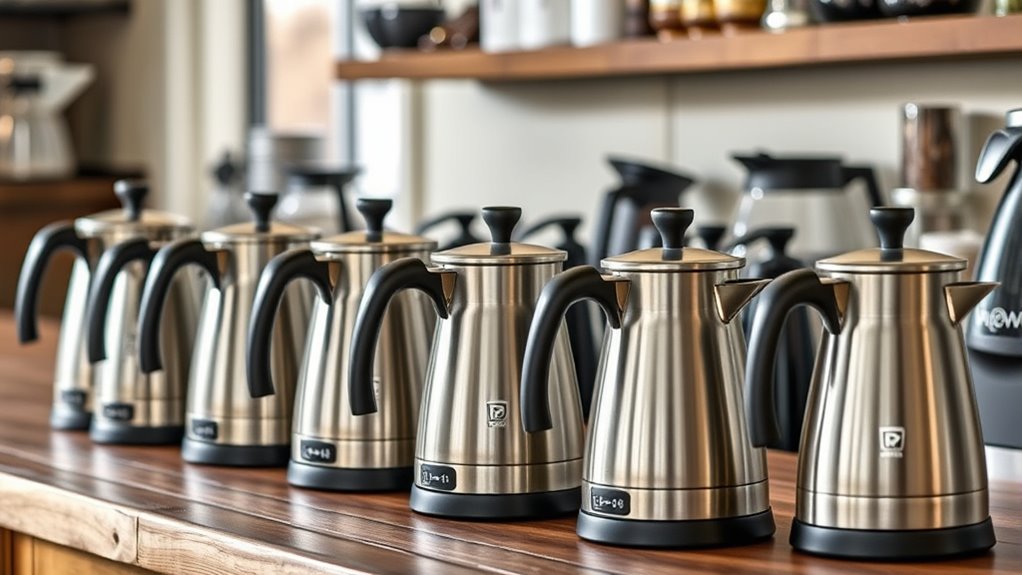 If you’re looking for the best pour-over kettles with variable temperature control, I’ve got you covered. These kettles let you precisely set and monitor water temps, ensuring your coffee brew hits the perfect extraction point. Many models feature quick heating, ergonomic gooseneck spouts, and safety functions like auto shut-off. Whether you want classic stainless steel or sleek modern designs, there’s a perfect fit for your brewing style. Keep exploring to find out which options stand out.