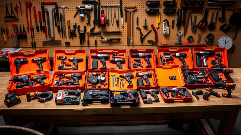 Understanding battery life and technology is essential for making the most of your power tool combo kit. I’ve found that longer battery life allows me to work for extended periods without constantly recharging, which boosts my productivity. I prefer lithium-ion batteries because they offer higher energy density and less self-discharge than older NiCad or NiMH options. With advancements like brushless motors and smart battery management systems, I notice improved performance and longer battery lifespan. Pay attention to voltage ratings, such as 20V or 18V, but remember that actual runtime depends on battery capacity and usage. Dual-battery systems and quick-charging features are game-changers, minimizing downtime and ensuring I can tackle demanding tasks with ease.