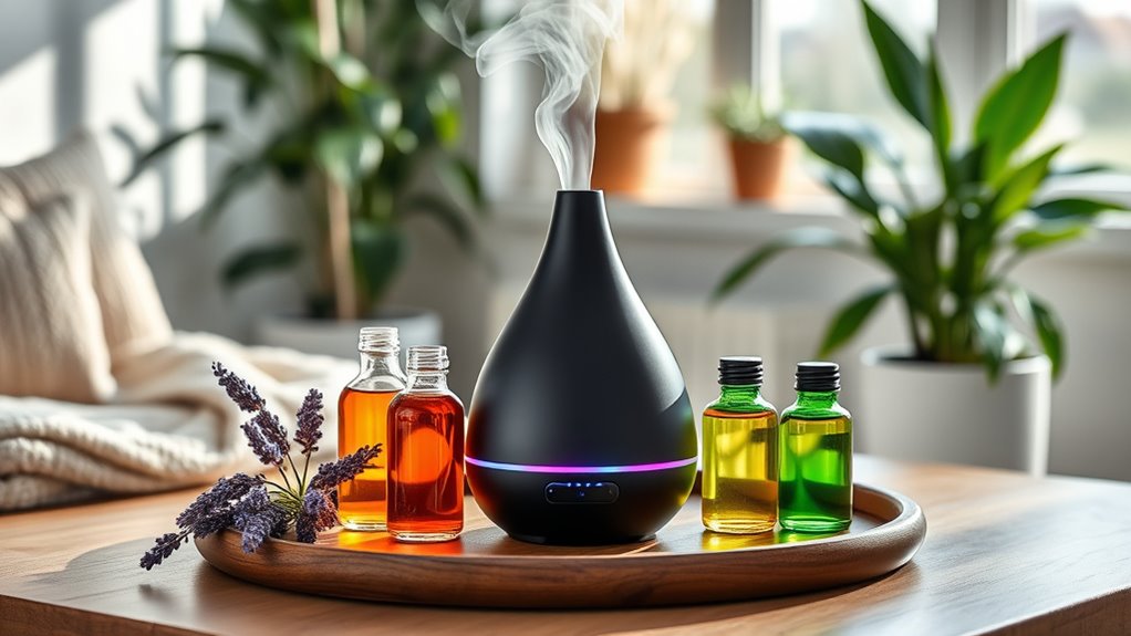 High-quality essential oils are the backbone of effective aromatherapy, so it’s *imperative* to select oils that are pure, natural, and free from unwanted additives. Look for oils sourced from reputable regions known for their aromatic plants—like lavender from France or eucalyptus from Australia—to *guarantee* authenticity. Therapeutic-grade oils, extracted through steam distillation or cold pressing, retain their potency and beneficial compounds, making them more effective. The scent’s intensity and longevity depend heavily on the oil’s purity and concentration, so choosing high-grade oils *assures* a more robust aroma. Proper storage in dark amber bottles is also *indispensable*, as it prevents light and heat from degrading the oils, preserving their quality over time. Prioritizing oil quality *assures* you get the most therapeutic benefits from your diffuser.
