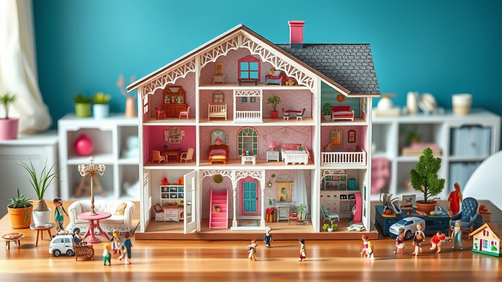 When choosing a premium dollhouse, considering its play value and educational benefits can greatly enhance your child’s developmental growth. A well-designed dollhouse offers diverse, realistic scenarios that boost imagination and creativity. Features like multiple rooms, detailed furniture, and movable elements encourage extended, open-ended storytelling. Incorporating accessories that mimic real household items supports role-playing, helping children understand daily routines and social interactions. Additionally, interactive setup and rearrangement of accessories promote fine motor skills, spatial awareness, and problem-solving abilities. These activities also foster organizational skills as kids decorate and reorganize their play spaces. Overall, a high-quality dollhouse isn’t just fun—it’s a powerful tool for cognitive development, nurturing creativity, coordination, and social understanding through engaging, educational play.