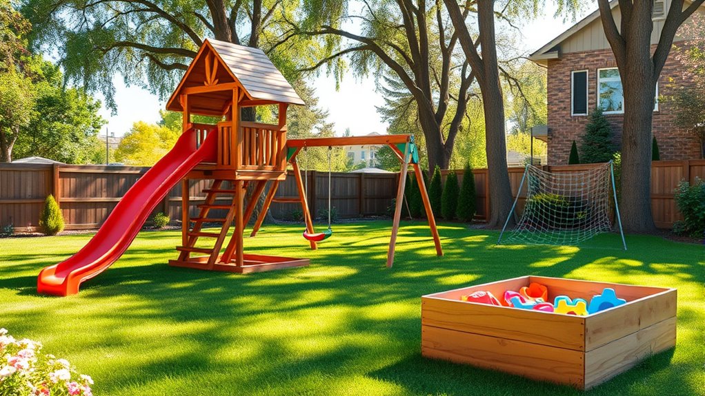 Weather resistance is vital when choosing outdoor play equipment, and I’ve found that premium sets are built to brave the elements. Many feature weatherproof finishes, rust-resistant metals, and UV-protected plastics that stand up to sun, snow, and rain. I recommend checking manufacturer details, but generally, these high-quality options promise protection against weather woes, ensuring your backyard fun doesn’t fade with the seasons.