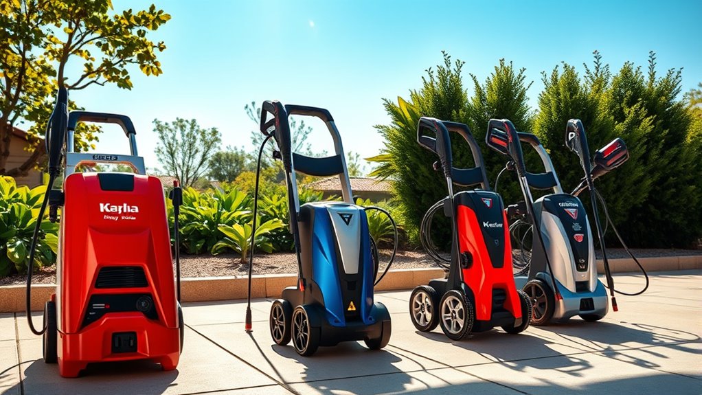 Looking for the best pressure washers of 2025? I’ve tested top models, including electric and gas options, with power ratings from 1700 to 3400 PSI. Whether you need lightweight units for home use or heavy-duty machines for industrial tasks, there’s something for everyone. Features like adjustable nozzles, foam cannons, and extended hoses boost efficiency and ease. Keep going to discover the top picks and how to choose the perfect one for your needs.