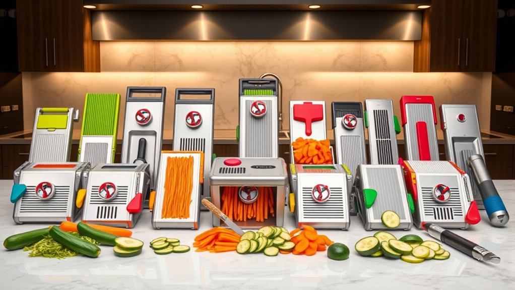 Looking for the best professional mandoline slicers to make meal prep effortless? I recommend models with adjustable thickness, versatile cutting modes, and sharp, durable blades. Safety features like safety locks, hand guards, and non-slip bases are essential for secure operation. Easy-to-clean, foldable designs guarantee quick storage and maintenance. If you want top options packed with these features, keep exploring—you’ll discover which slicers truly stand out for your kitchen needs.