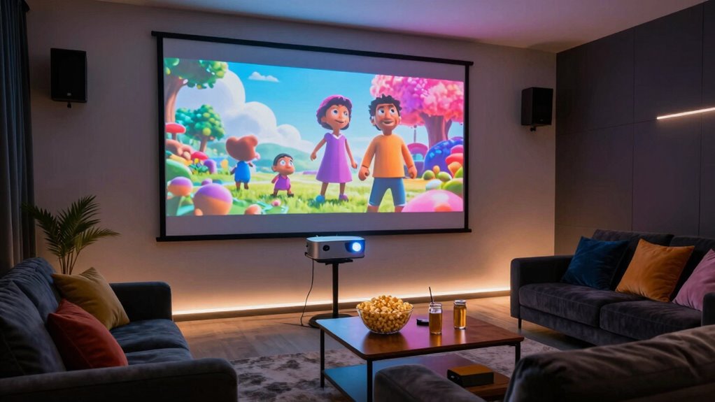 I’ve compiled a list of the 11 best projectors for movie nights in 2026, featuring models with incredible features like 4K resolution, WiFi 6, Bluetooth, and high brightness up to 2,500 lumens. These projectors are portable, flexible, and packed with smart options like built-in streaming apps. Whether you’re watching indoors or outdoors, these options balance picture quality with easy setup. Keep exploring to discover which projector might be perfect for your next movie night.