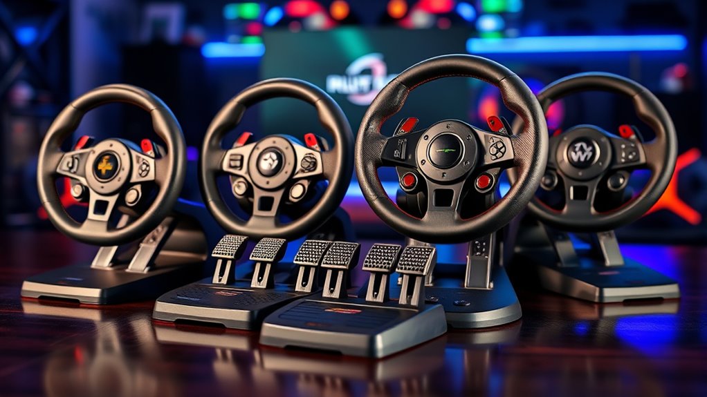High-quality force feedback substantially elevates the realism of your racing experience by accurately simulating tire grip, terrain, and turns. Dual-motor or high-definition systems like TRUEFORCE or H.E.A.R.T. process data thousands of times per second, delivering immersive sensations that mirror real vehicle responses. The rotation angle, such as 900 degrees, combined with precise force feedback, offers more authentic steering and driving feedback. Adjustable force feedback levels let you personalize the intensity, enhancing both realism and comfort during extended gameplay. Quality systems provide linear resistance and recentering that closely mimic real car handling, boosting immersion and control. When choosing a racing wheel, prioritize those with advanced force feedback technology to truly feel every turn, bump, and slip for a more lifelike experience.