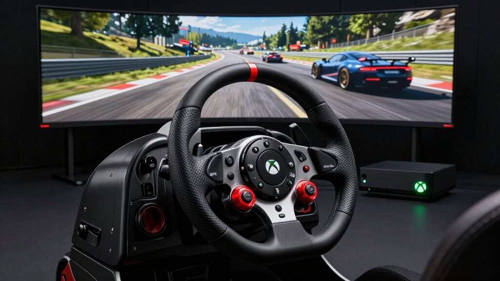 Choosing a racing wheel for Xbox means paying close attention to its adjustment and customization options, which are key to tailoring the experience to your preferences. Look for wheels with adjustable steering angles, like 270° or 900°, so you can match different racing styles and game requirements. Customizable force feedback settings are essential for realism; they let you fine-tune resistance levels for comfort. Button remapping and programmable controls help personalize your setup, making gameplay more intuitive. Adjustable pedals, both in position and sensitivity, improve ergonomic comfort. On-the-fly adjustments for dead zones, sensitivity, and force feedback are a big plus, allowing you to tweak settings without stopping the game. These features ensure a more immersive, comfortable, and personalized racing experience.